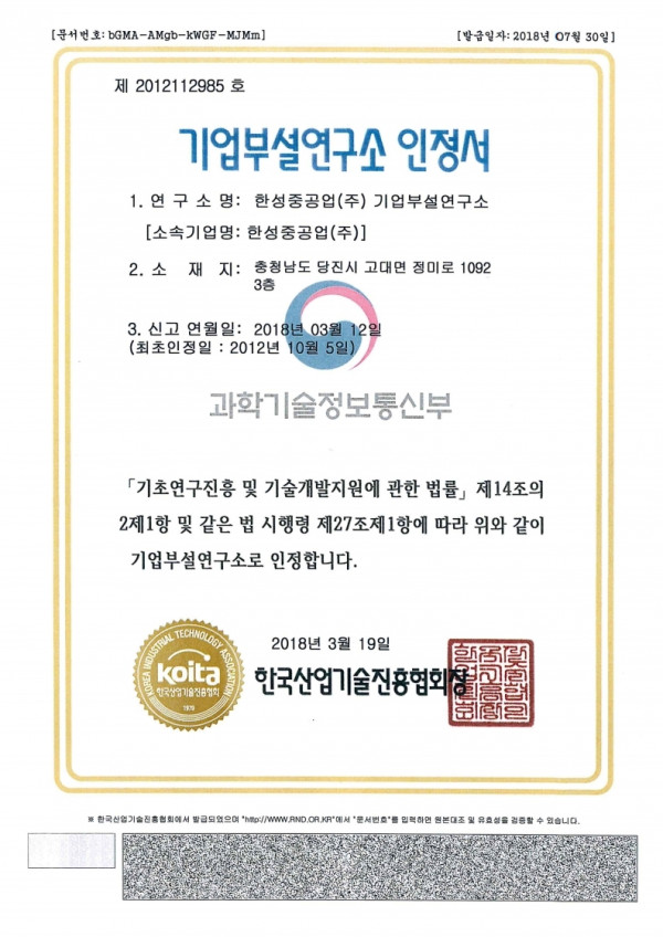 기업부설연구소 인정서