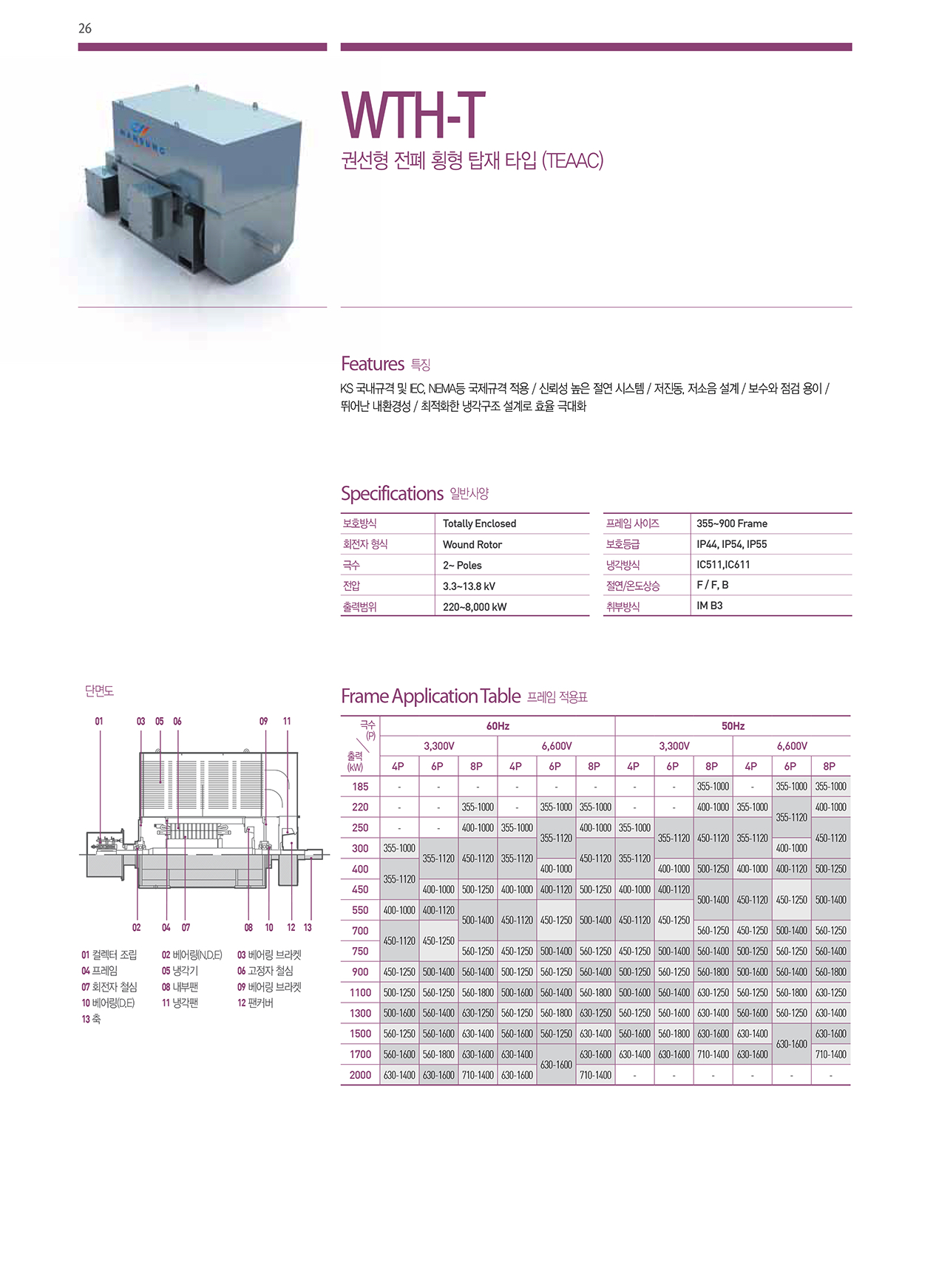 KS 국내규격 및 IEC, NEMA등 국제규격 적용 / 신뢰성 높은 절연 시스템 / 저진동, 저소음 설계 / 보수와 점검 용이 / 뛰어난 내환경성 / 최적화한 냉각구조 설계로 효율 극대화
