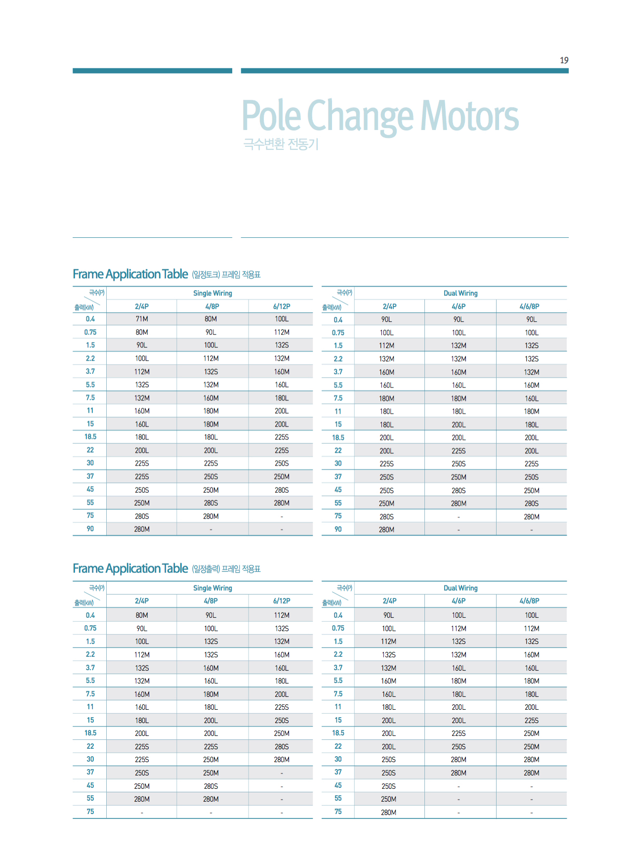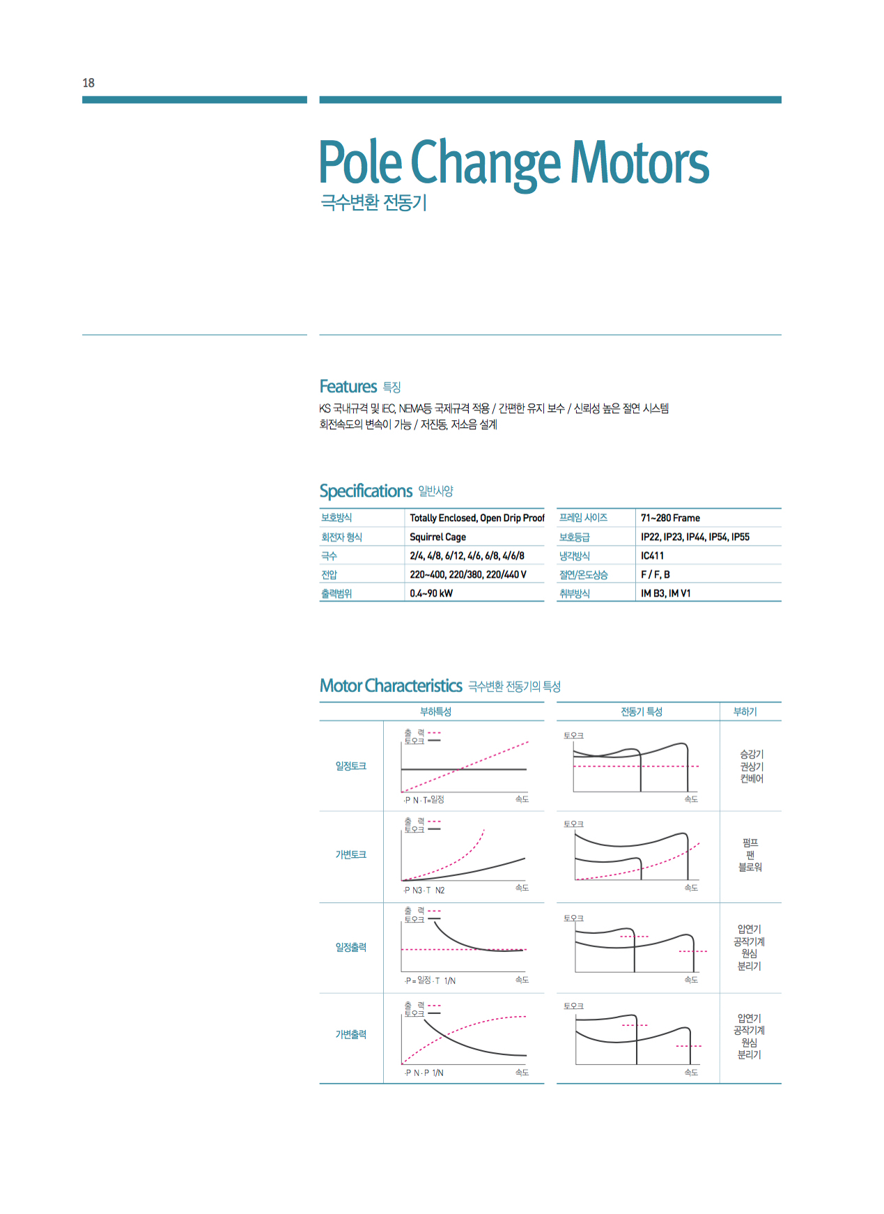 KS 국내규격 및 IEC, NEMA등 국제규격 적용 / 간편한 유지 보수 / 신뢰성 높은 절연 시스템 회전속도의 변속이 가능 / 저진동, 저소음 설계