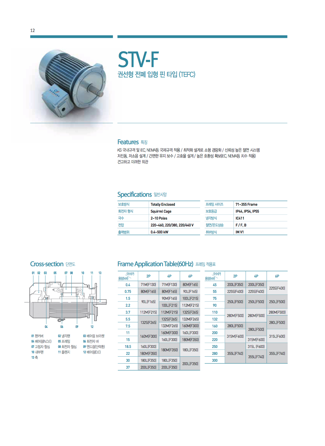 KS 국내규격 및 IEC, NEMA등 국제규격 적용 / 최적화 설계로 소형 경량화 / 신뢰성 높은 절연 시스템 저진동, 저소음 설계 / 간편한 유지 보수 / 고효율 설계 / 높은 호환성 확보(IEC, NEMA등 치수 적용) 견고하고 미려한 외관